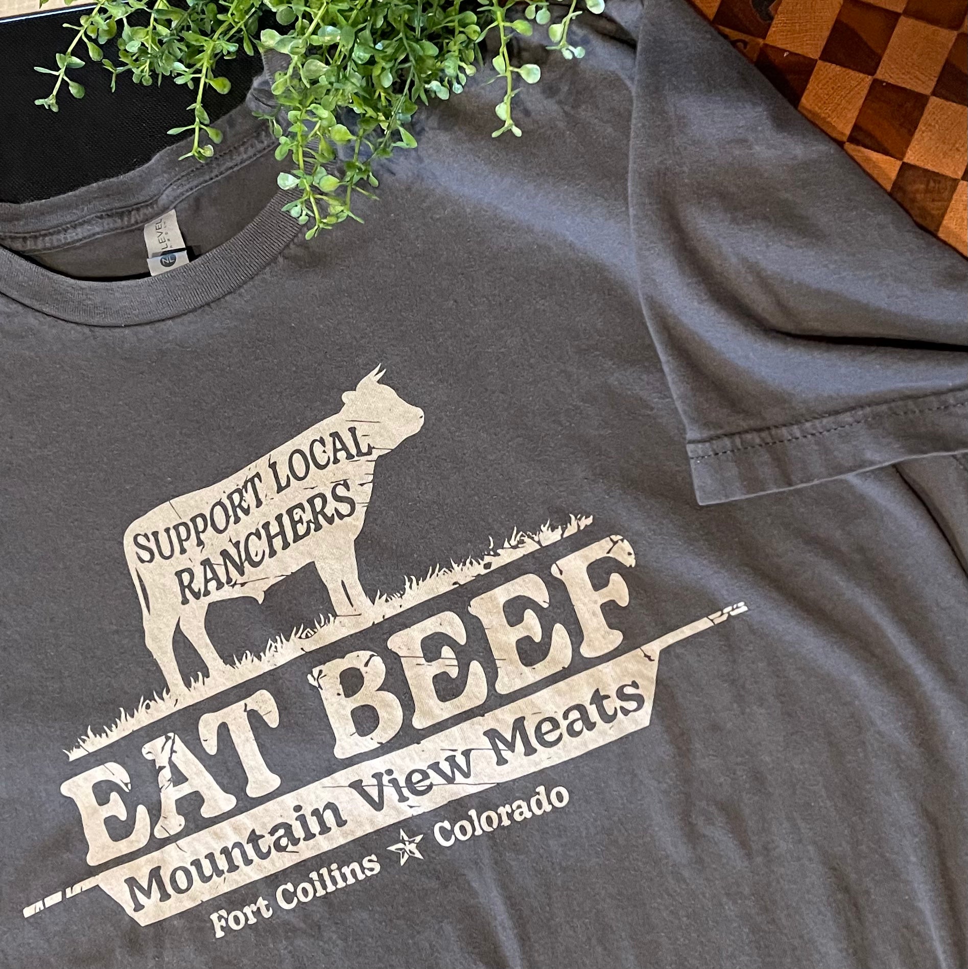 Show support for local ranchers and the beef industry with our super soft 100% cotton t-shirt.  In gunmetal grey with off-white print.  Sorry, we only have XXl left!